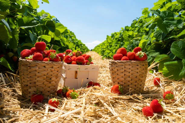 Pladsen ligger lige ved siden af en stor pluk-selv jordbærmark.
